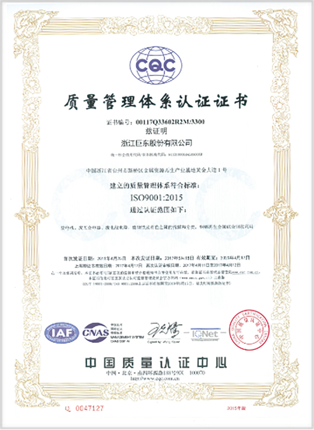 2017年5月取得ISO9001認證