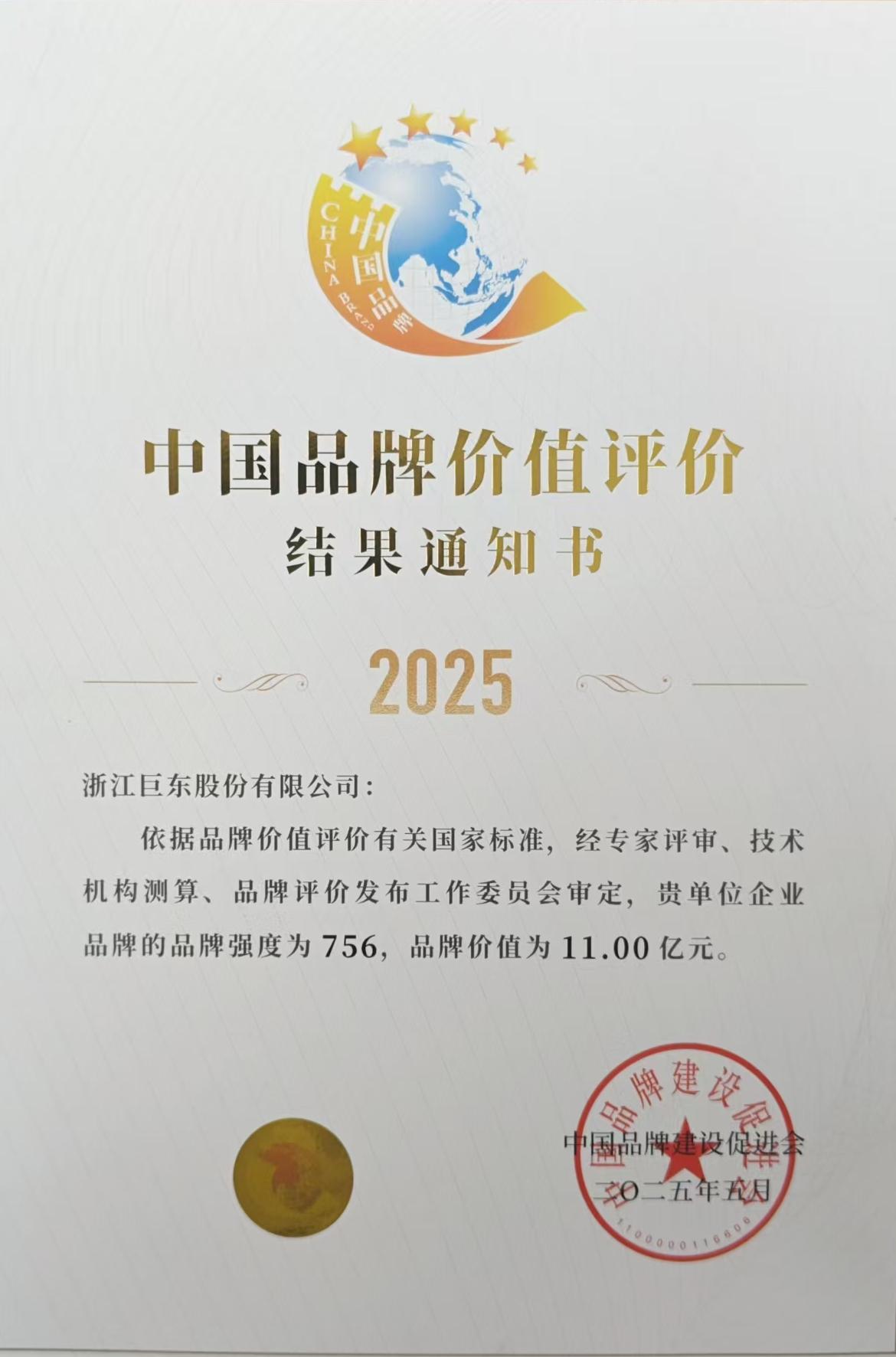 2025中國品牌價值評價結(jié)果通知書-品牌價值11億元